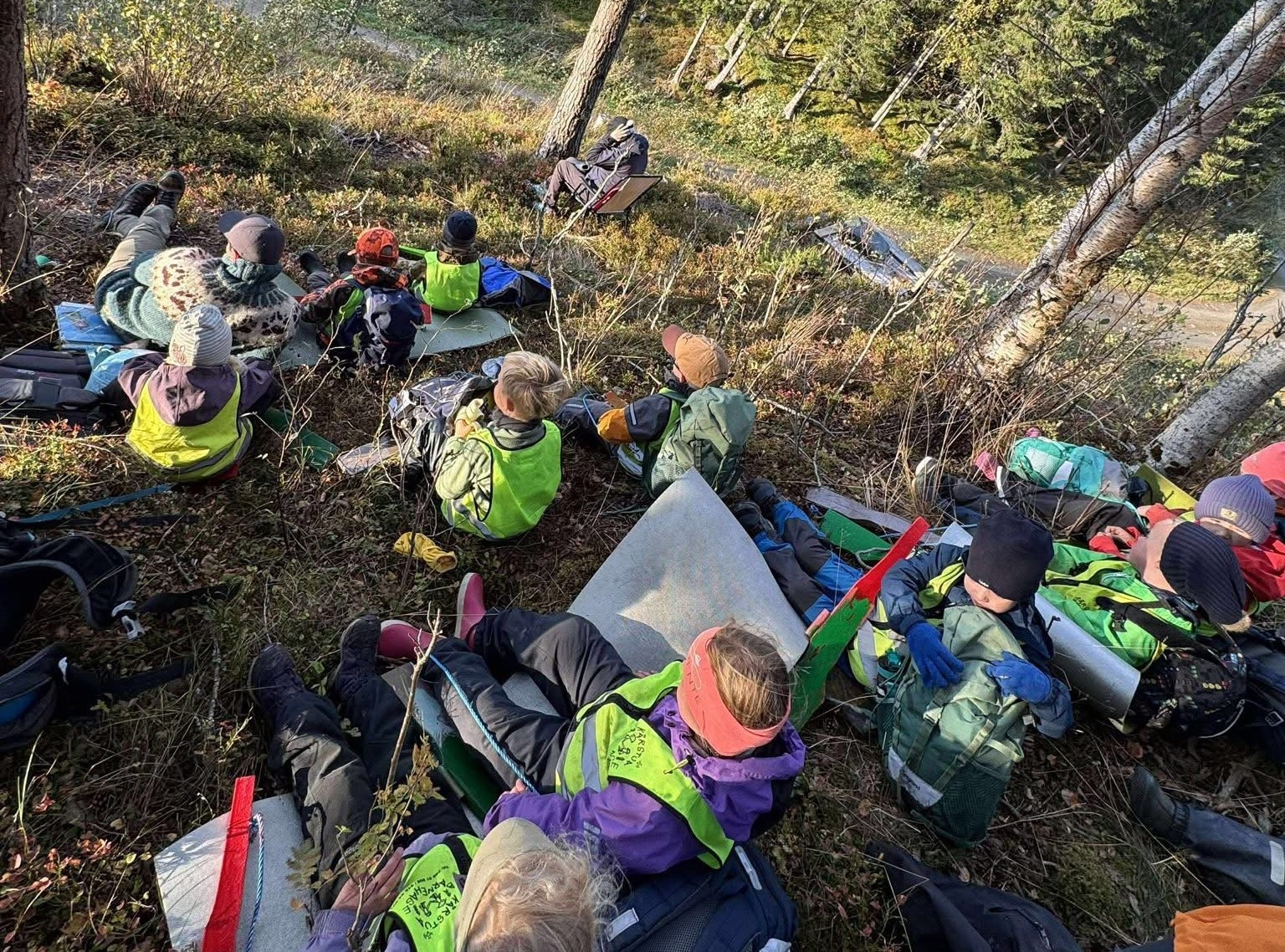 I Kårstua får førskole-ungene bli med på jakt. Den foregår oppå Rennankammen og i Gilstadmarka. Førskole-jegerne deltar på elgjakt, og lager seg egne tregevær, men "vi-leike-itj-ælgjakt" ! Vi sitter på post inne på nylandet, hvor elgen ofte springer over åkrene så vi får sett rompa på den. Merete går med elghund som sporer elgen fram til jegerne på post. Ofte blir det skutt elg,-da går vi fram til skudd-plassen og får se utvomming og ta på elgen.